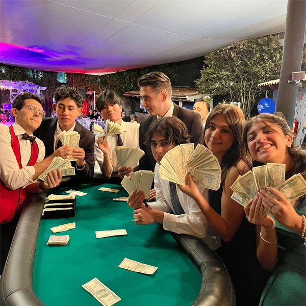 Lleva la mejor experiencia hasta tu mesa con los mejores dealers entusiastas altamente capacitados, donde cada uno de los jugadores tendrá su propio lote de billetes. Podrás apostar tu dinero en el juego o en las diferentes dinámicas que se irán realizando en tu evento temático. También gozarás con coreografías donde participarán todos tus invitados.